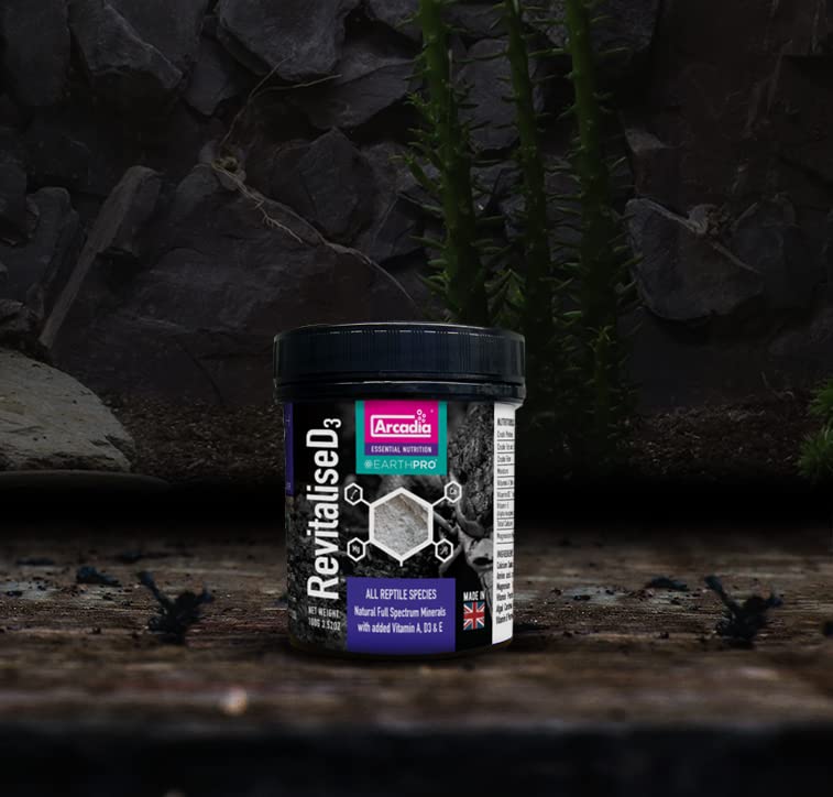 Details: EarthPro-ReVitaliseD3 is a natural supplement with full-spectrum minerals and added vitamins A, D3, and E. It is rich in earth minerals, bee pollen, carotenoids, amino acids, and magnesium. Safe and effective for all reptiles and amphibians, it should be lightly dusted on food at 1 gram per 100 grams of food, with any unused powder discarded. Store it in a cool, dry place, keeping the pot resealed, and do not refrigerate. This product is for reptile and animal use only, not for human consumption.
