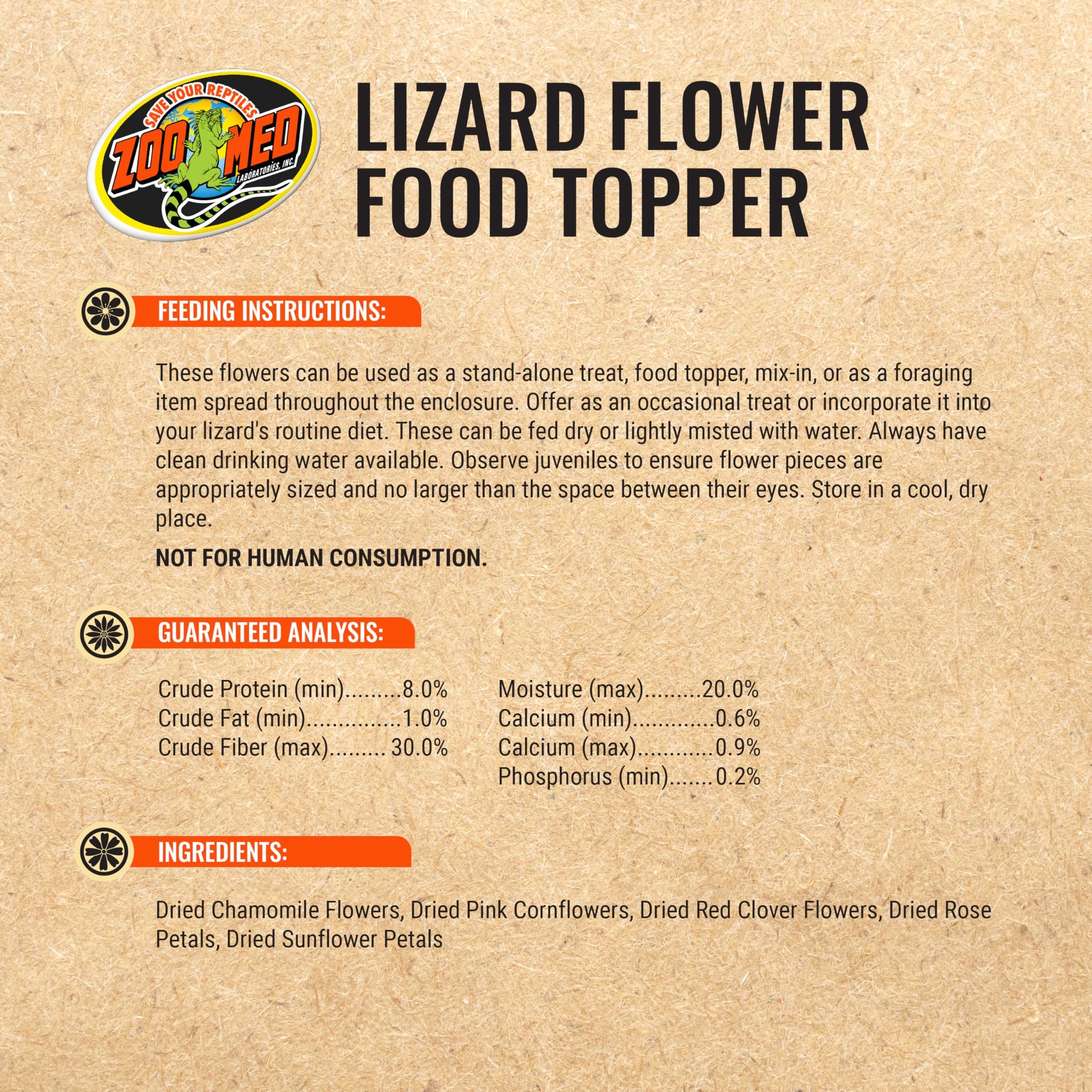 - Zoo Med's Flower Food Topper is a high fiber dietary supplement composed of dried flowers. Flowers are a natural and vital component in the diets of herbivorous and omnivorous lizards and tortoises, providing much-needed fiber, minerals, and vitamins.