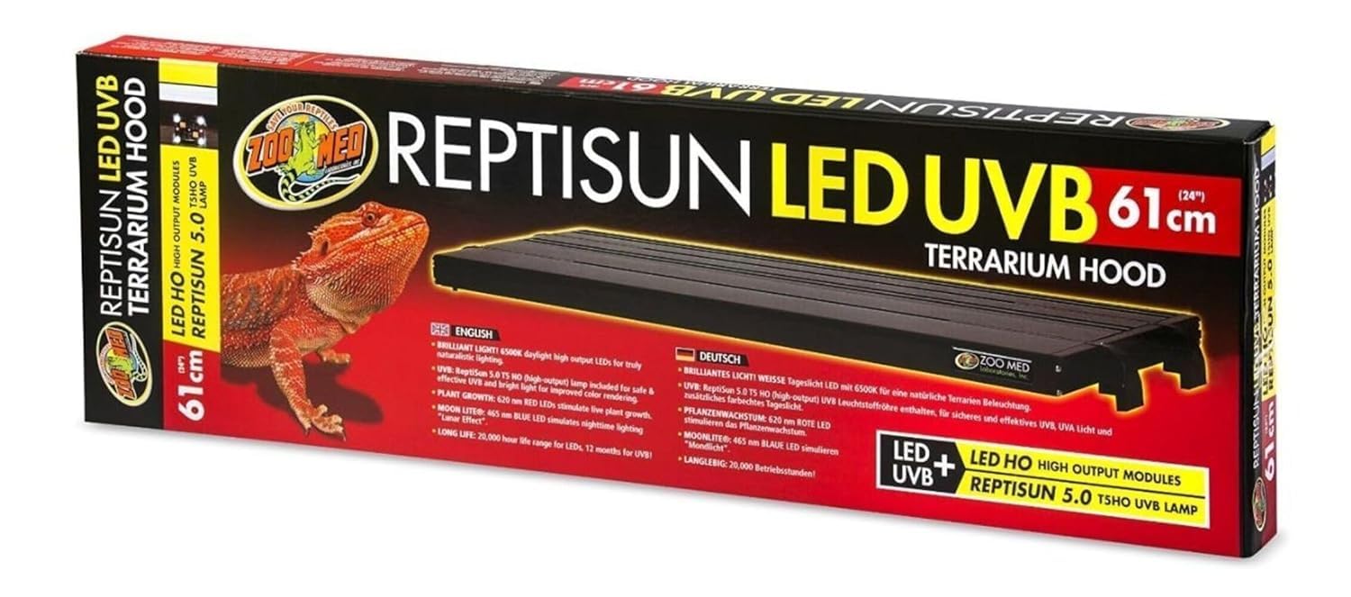 Details: The reptisun terrarium hoods are low profile hoods designed to hold one t8 size Linear fluorescent lamp. The reptisun terrarium hoods feature a built-in reflector which allows for deeper penetration of visible light and uvb into your terrarium. Available in 20, 24, 30, 36 and 48 inches. Convenient on/off switch.
